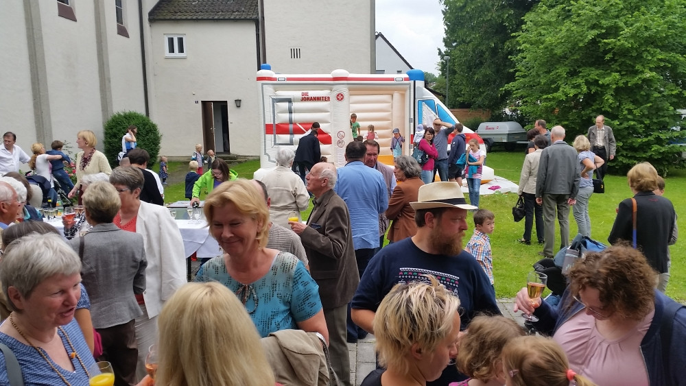 Begonnen hatte das Fest natürlich mit einem Gottesdienst, der in diesem Jahr von unserem Kindergarten in Pfaffing gestaltet wurde. Kinder, Eltern und die Angestellten des Kindergartens feierten zusammen mit der zahlreich anwesenden Gemeinde. Im Anschluss gab es wieder den traditionellen Sektempfang. Für die Kinder war mit Hüpfburg, Kinderschminken, Schatzsuche und der Sendung mit der Maus gesorgt. Der Grill war mit Würstl und Fleisch reichlich belegt. Zusammen mit dem reichhaltigen Salatbuffet und kühlen Getränken konnten sich alle Besucher stärken. Dazu spielte die Musikgruppe "CoverClan" Hits aus den 70er- und 80er-Jahren. Manche konnten sich selbst das Schwingen des Tanzbeines nicht verkneifen. Den Ausklang bildete eine musikalisch unterstützte Andacht durch Pfarrer Möller.